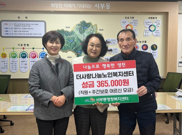 지난 1월 5일 서부동에 위치한 더사랑나눔노인복지센터(센터장 김춘자)는 서부동행정복지센터를 방문해 이웃돕기 성금 36만5000원을 전달했다.