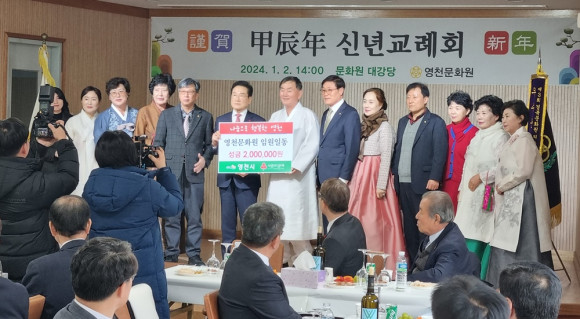 영천문화원(원장 류시홍) 임원들은 새해부터 이웃돕기를 실천해 귀감이 되고 있다. 문화원 임원들은 1월 2일 문화원에서 신년교례회를 하면서 참석한 최기문 시장에 전달했다. 류시홍 원장은 “임원들의 단합된 모습을 보여줘 무엇보다 의미가 있다.”고 했다.