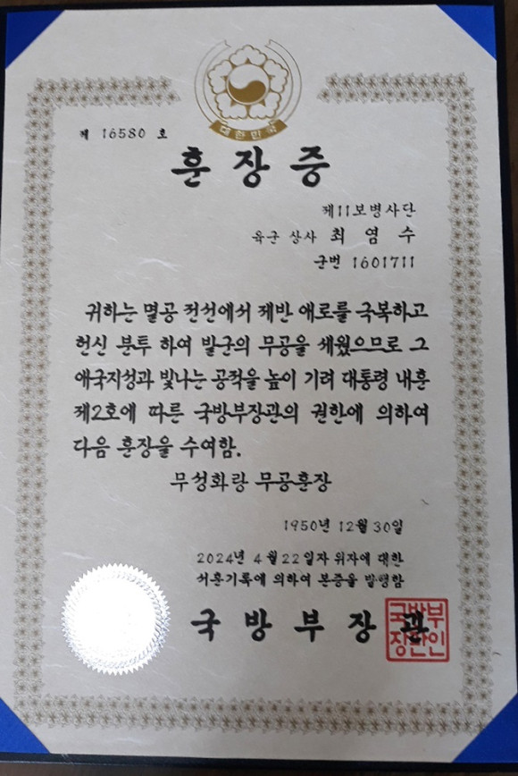 5월 14일 본사에 알려온 가족은 “아버지는 육군 상사로 근무하시면서 6·25때 전사를 했다. 이후 국가유공자는 되었으나 무공수훈증이 없어 안타까워했는데 며칠 전 국방부에서 훈장증을 보내왔다. 훈장증에는 아버지가 전장에서 헌신 분투한 흔적이 살아 있는 것 같다.”고 설명했다.