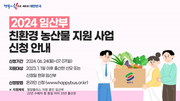 영천시가 6월 24일부터 7월 7일까지 관내 임산부를 대상으로 2024년 임산부 친환경농산물 지원 사업을 신청받는다. 대상은 영천시에 주소지를 두고 있으며 신청일 현재 임신부이거나 2023년 1월 1일 이후 출산한 산모이다.