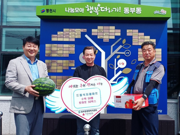 영천시 망정동에 위치한 ㈜드림식자재마트 창신점(공동대표 박문규·조유래·정경태)은 지난 6월 26일 여름을 맞이해 동부동행정복지센터에 수박 50통, 토마토 50박스를 기탁했다.