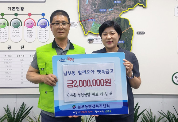 남부동 지역사회보장협의체 위원인 성원산업 이길태 대표가 지난 7월 1일 남부동 ‘함께모아 행복금고’에 성금 200만원을 기탁했다.