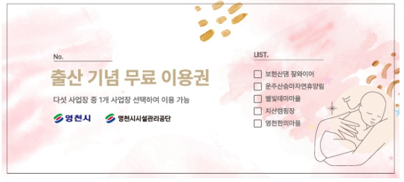출산 기념 무료 이용권은 영천시 보건소에서 출산가정 축하용품 지원 거주지 배송 시 함께 받을 수 있다.