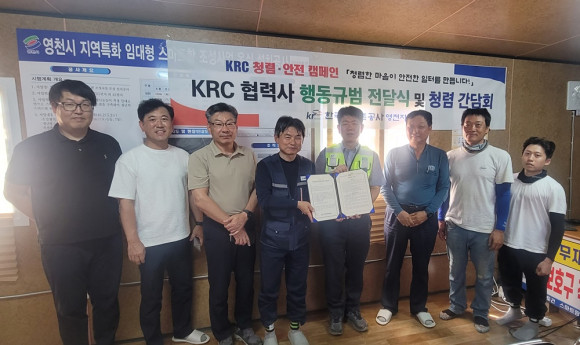 한국농어촌공사 영천지사(지사장 나창식)는 지난 8월 14일 영천시 금호읍 소재 ‘지역특화 임대형 스마트팜 조성사업’현장을 찾아 청렴문화 정착 및 안전의식을 고취시키기 위한 ‘KRC 청렴.안전캠페인’을 실시하고 냉음료 나눔행사와 시공사에게 공사의 청렴의지를 전달하고 상호 협력하기 위한 협력사 행동규범 전달식 및 청렴 간담회를 진행했다.