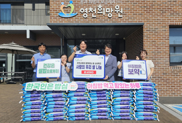 NH농협영천시지부(지부장 박성용)는 (사)도농상생국민운동본부 후원으로 5일 추석을 맞아 지역사회 취약계층을 위해 ‘추석맞이 사랑의 쌀 나눔’행사를 개최했다. 이번 행사는 추석 명절을 맞아 영천희망원과 영천종합사회복지관에 사랑의 쌀(10㎏) 120포를 나누며 지역사회 복지향상에 기여하고 도시와 농촌이 상생하기 위해 마련됐다. 박성용 지부장은 “사랑의 쌀 나눔을 통해 어려운 이웃들이 풍성하고 행복한 추석 명절을 지내는데 도움에 되면 좋겠다.”며 “앞으로도 우리 영천 지역사회에 공헌하는 농협이 되겠다.”고 말했다.
