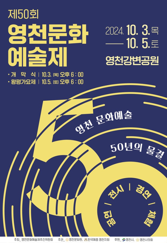 ‘영천 문화예술, 50년의 물결’이라는 슬로건 아래, 읍면동 대항 민속놀이, 전국 풍물&난타 경연대회, 전국품바페스티벌, 왕평가요제 등 다채로운 프로그램이 진행될 예정이다.
