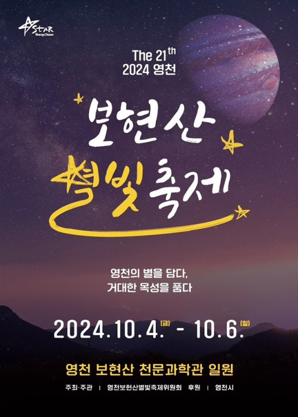 | | | ⓒ 영천시민신문 | | 영천의 대표 축제인 보현산별빛축제가 ‘영천의 별을 담다, 거대한 목성을 품다’를 주제로 오는 10월 4일부터 6일까지 영천 보현산천문과학관 일원에서 열린다. 영천은 별의 도시로 청정 자연이 선사하는 아름다운 밤하늘과 국내 최대 광학 망원경을 갖춘 보현산 천문대 등 풍부한 천문과학 인프라를 자랑한다. 이번 축제의 주요 프로그램으로는 초청가수 이석훈의 공연과 드론라이트쇼가 포함된 개막행사가 예정돼 있으며 보현산별빛축제의 시그니처 프로그램인 누워서 별보기, 별관측, 천문과학 강연 등 다채로운 체험 프로그램이 마련된다.