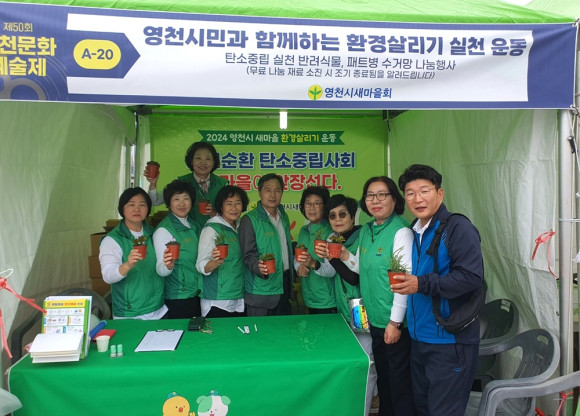 이날 행사는 ‘2024 영천문화예술제’ 행사 내 부스에서 추진됐으며 새마을이사회, 협의회 및 부녀회, 직·공장 및 문고회 회원 100여 명이 참여해 가정용 투명 페트병 수거망 2500여 개를 시민들에게 배부하면서 △환경 친화적인 제품 구매 △일회용품 사용 줄이기 △과대포장 줄이기 등 일상생활 속에서 환경 사랑 실천 방법을 홍보했다.