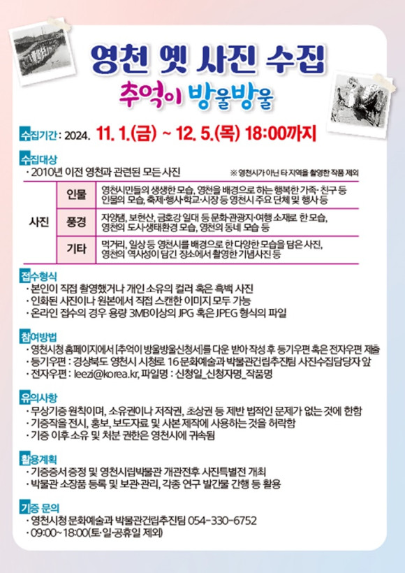 영천시는 영천시립박물관의 풍성한 유물과 콘텐츠 확보를 위해 오는 11월 1일부터 12월 5일까지 영천을 배경으로 하는 옛 사진을 수집한다.