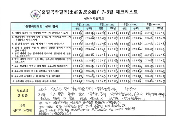 | | | ⓒ 영천시민신문 | | 학교에서의 모든 교육이 중요하지만 특히 중학교 시절은 인성교육이 매우 중요하다. 성남여자중학교에서는 한 해 동안 꾸준히 ‘출필곡 반필면’을 통한 ‘효 교육’을 실천하고 있다.
