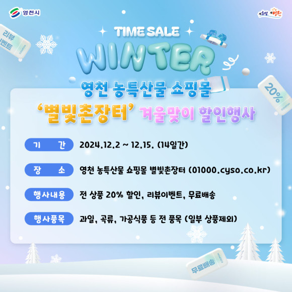 영천시는 지역 농특산물 온라인 쇼핑몰 ‘별빛촌장터(01000.cyso.co.kr)’에서 본격적인 겨울 시작에 맞춰 특별 할인행사를 진행한다.