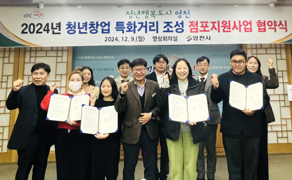 영천시는 12월 9일 중앙동, 서부동 일대를 ‘청년창업 특화거리’로 조성하기 위해 특색있는 창업 아이템으로 선정된 청년창업가 4팀과 협약을 체결했다.‘영천마늘 양념어묵’, ‘유리 공예 공방’, ‘피부 관리’, ‘잡화상점’ 사업을 구상 중인 청년 창업가 4팀과 영천시 청년창업지원센터, 영천청년센터가 협약식에 함께해 분야별 전문가의 연계 지원을 협의했다.