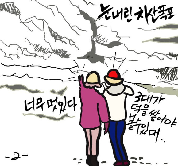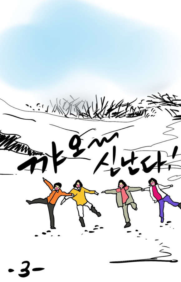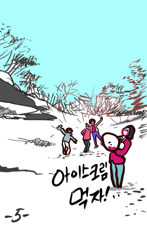 이색적인 그림은 경계탐사대 대원인 정수정 대원이 그린 것인데 경계탐사대원들의 겨울 활동을 다소 코믹하게 6컷으로 표현하고 있다.