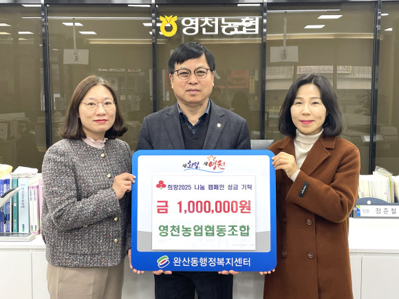 영천농협(조합장 성영근)이 12월 18일 관내 어려운 이웃을 위한 성금 100만원을 완산동행정복지센터에 기탁하며 희망2025 나눔 캠페인에 동참했다. 영천농협은 지역 최대 규모로 조합원 4000 여 명을 보유하고 있으며 매년 나눔 캠페인 참여와 인재 양성을 위한 영천시장학회 장학금 기부, 각종 봉사활동 실천 등 지역사회의 나눔문화 활성화에 앞장서고 있다.