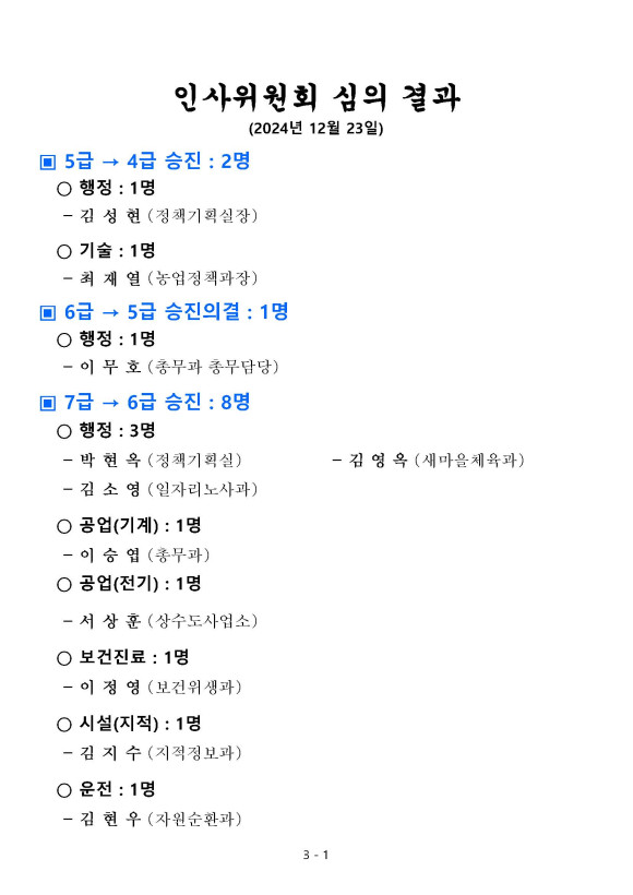 인사위원회 심의 결과(2024년 12월 23일)