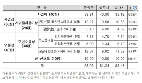 한편 대구시가 발표한 후보지별 평가 결과에서 ‘지자체의지’ ‘주민동의’ ‘민원’ 등에서 영천시가 유리하다고 유치전에서는 파다했는데 말로만 부르짖는 것이 증명하듯 이 부분에서만 군위군과 4점 차이가 벌어지기도 했다.