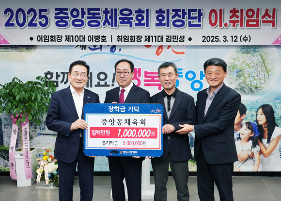 중앙동체육회는 중앙동 행정복지센터에서 이·취임식 행사를 개최하며 지역인재를 위한 뜻깊은 나눔을 실천했다. 평소 어려운 지역주민들을 위한 나눔활동에 앞장서며 성금 기탁 등 취약계층의 복지증진을 위해 노력해왔다. 2011년부터 지역인재를 위해 장학금을 기탁하며 인재 양성을 위한 나눔에 큰 뜻을 두고 현재까지 총 500만원의 장학금을 기탁했다.