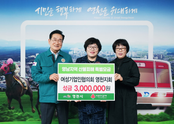 | | | ⓒ 영천시민신문 | | 여성기업인협의회 영천지회에서도 영남지역의 산불피해 복구를 바라며 성금 300만원을 기부했다. 여성기업인협의회는 여성기업인들의 권익신장 및 경쟁력 강화에 앞장서고 있으며 이외에도 이웃돕기 성금, 장학금 기부, 지역사회를 위한 봉사활동을 펼쳐 왔다. 김태영 지회장은 “예기치 못한 산불로 피해를 입은 주민들에게 진심 어린 위로를 전한다.”고 말했다.
