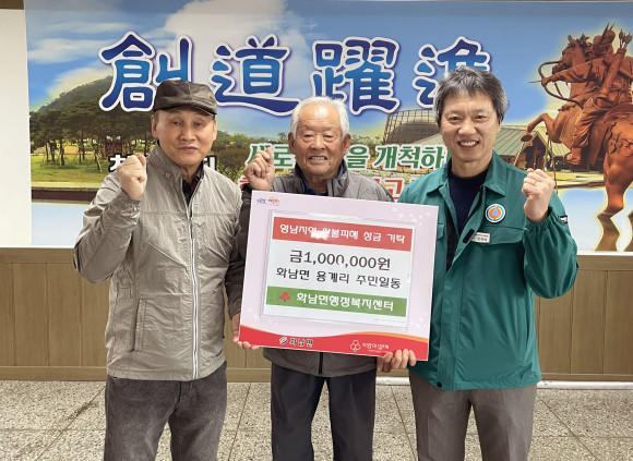 화남면은 4월 14일 최근 영남지역 대형 산불로 삶의 터전을 잃은 이재민을 돕기 위해 관내 여러 단체와 지역주민들의 기탁 릴레이가 이어지고 있다. 화남면 이장협의회(회장 정영욱) 260만원, 화남면 주민자치위원회(회장 성석모) 100만원, 월곡1리(이장 정영욱) 주민일동 100만원, 금호2리(이장 조연호) 주민일동 100만원 등 총 560만원의 성금을 기탁하며 이재민들의 빠른 일상 회복을 기원했다. 또 월곡1리와 금호2리 마을 주민들의 자발적인 모금 참여가 더해져 그 의미가 더욱 컸다.