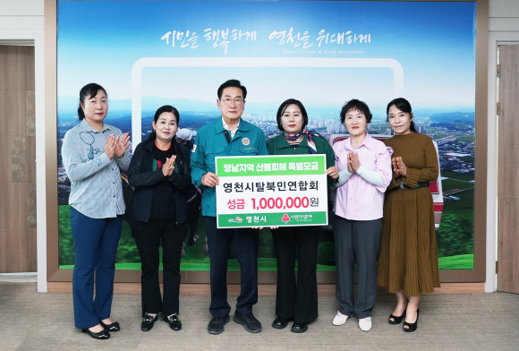 영천시탈북민연합회(회장 설영희)는 4월 28일 영천시청을 방문해 산불피해 성금 100만 원을 전달했다. 설영희 회장은 “갑작스러운 산불로 삶의 터전을 잃은 이재민들의 아픔에 작은 위로라도 드리고자 작은 성금이지만 회원들의 정성이 담겼다.”고 전했다.