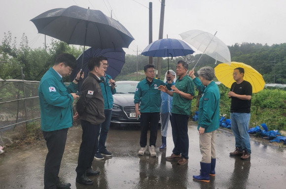 ↑↑ 최기문 영천시장이 집중호우로 침수된 농경지를 둘러보며 긴급 복구 방안을 논의하고 있다.