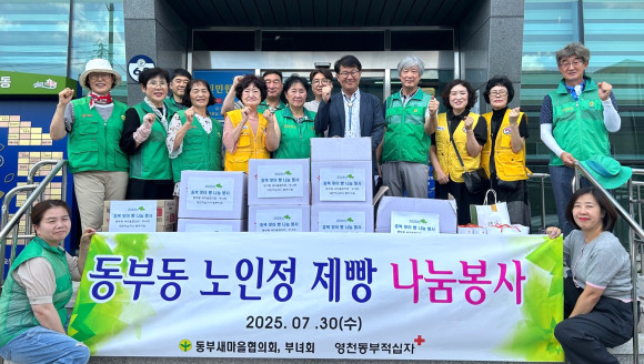 | | | ⓒ 영천시민신문 | | 동부동 새마을지도자협의회(회장 박찬우)·새마을부녀회(회장 양혜숙)와 대한적십자사 동부 봉사회(회장 정청자)는 7월 30일 중복을 맞아, 관내 39개 경로당을 방문해 어르신들께 빵을 전달하며 건강한 여름 나기를 응원했다. 이번 봉사활동은 무더위에 취약한 어르신들의 영양 보충과 기력 회복을 돕기 위해 마련됐다. 3개 단체 회원들은 직접 빵을 포장하고 경로당을 찾아 어르신들의 안부를 살폈다.