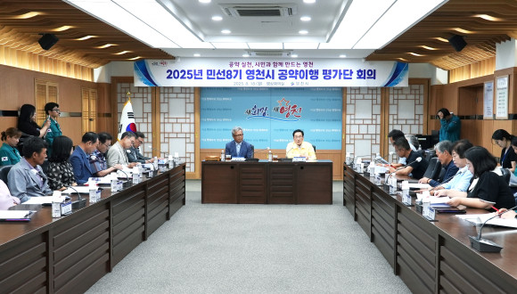 영천시는 8월 18일 시청 영상회의실에서 ‘2025년 민선8기 공약이행 평가단 회의’를 개최했다. 이날 회의에는 공약이행 평가단 위원 16명이 참석해 민선8기 4년차를 맞아 공약사업 추진 현황을 점검하고 실효성 제고를 위한 발전방안을 논의했다.