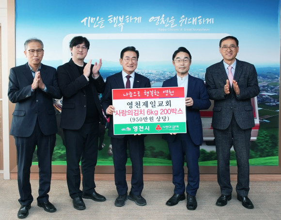 | | | ⓒ 영천시민신문 | | 영천시는 12월 9일 영천제일교회에서 관내 어려운 이웃을 위한 김장김치 200박스(950만원 상당)를 기탁했다. 영천제일교회는 2021년부터 매년 김장봉사를 이어오고 있으며 취약계층을 위해 사랑의 쌀 나눔, 긴급 의료비 지원, 장애인 가정 사랑의 집수리, 중증 장애인 이불 교체, 재활 장애인 주간 보호비 지원, 오지 거주 장애인 사랑의 장바구니 배달, 어울림 한마당 행사 및 장애인 초청 잔치 개최 등 다양한 봉사활동을 펼치며 이웃사랑을 꾸준히 실천하고 있다.