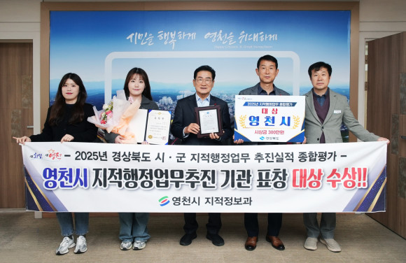 영천시는 12월 15일 경상북도청에서 열린 ‘2025년 지적행정업무 추진실적 종합평가’ 시상식에서 올해 신설된 최고상인 ‘대상’을 수상했다. 이와 함께 지적정보과 신진아 주무관이 지적행정업무 유공공무원으로 선정돼 도지사 표창을 받았다.