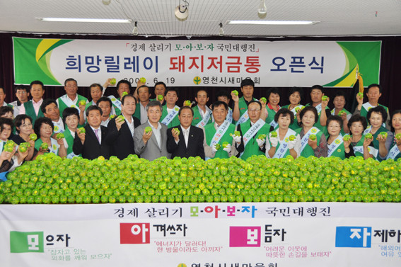 영천시새마을회(회장 고태운)가 경제살리기 국민대행진 '희망릴레이 돼지저금통' 모금운동을 통해 배가 꽉 찬 3천여 개의 돼지저금통을 한 자리에 모았다. 지난 19일에는 영천축협 대강당에서 새마을 회원들이 저금통에 담겨 있던 동전분류작업을 했다. 수익금 전액은 영천시장학회 기금으로 전해질 예정이다.