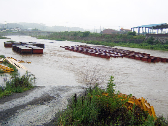 사진은 대창면 대창리 포척교 공사 현장에 미처 치우지 못한 철재 자재들이 불어난 강물에 잠겨있다.