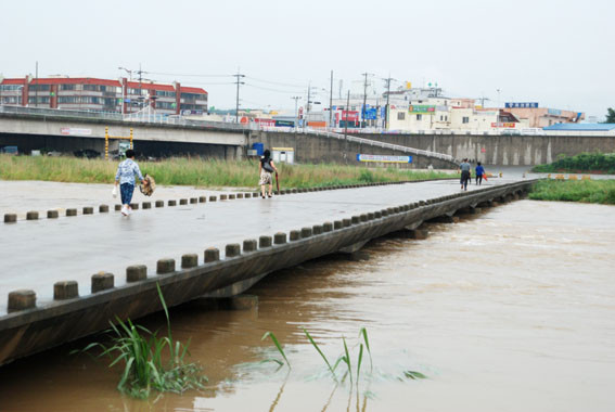 55.8㎜의 강우량을 보인 지난 15일 금호강물이 불어나면서 영동교 아래 잠수교 상판까지 물이 차올랐다(사진).