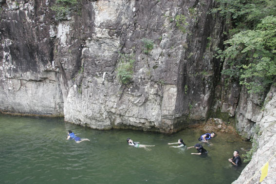 ↑↑ 초록원 앞의 용추에서 수영을 즐기는 관광객.