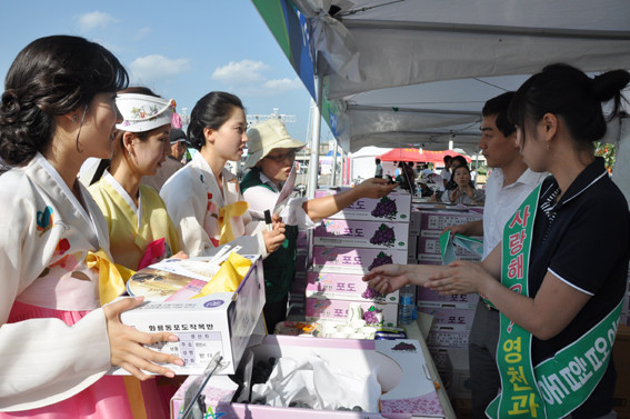 영천포도아가씨들이 불우이웃돕기 성금모금을 하면서 행사장에 마련된 복숭아나무에 달기 위한 소원리본을 시민들에게 나눠주고 있다.