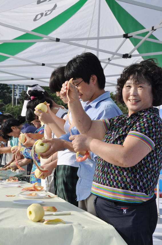 농산물게임 중에서 사과껍질 길게 깎기 대회에 참가한 시민이 정성껏 깎은 사과껍질을 보여주며 환하게 주고 있다.