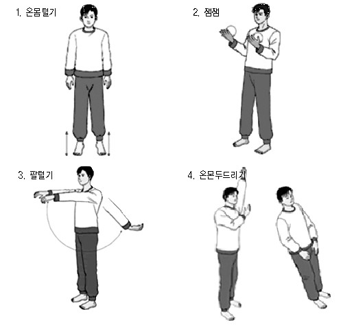1. 온몸 털기 : 발 모양을 십일 자로 서서 무릎을 펴고 발뒷꿈치만 살짝 빠르게 들었다 놓았다 한다.10분 이상 실시한다.