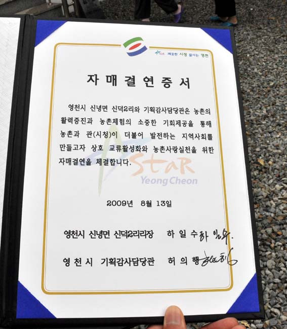 현재 자매결연을 한 곳은 기획감사담당관(신녕면 신덕2리), 보건사업과(북안면 용계리), 농촌지도과(임고면 사1리), 건강관리과(북안면 도천1리)이다. 산림녹지과(화남면 용계리)와 과수유통과(고경면 오룡2리)는 9월 중 결연식을 할 예정이다.