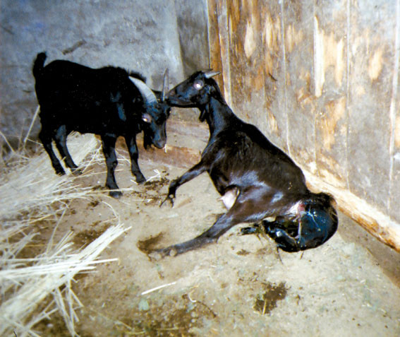어미 흑염소의 출산광경을 아빠흑염소가 안쓰러운듯 지켜보는 모습이 이채롭다.(화남면 대천2리 이해경씨 외양간)