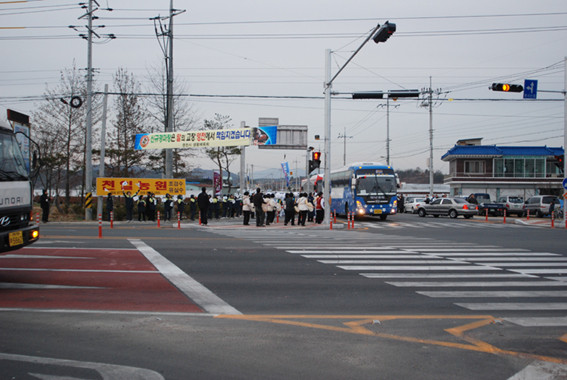 ↑↑ 평가단을 태운 버스가 금호읍 교대사거리에 멈춰서자 시민 수백명이 버스를 향해 손을 흔들며 환영을 표시하고 있다.