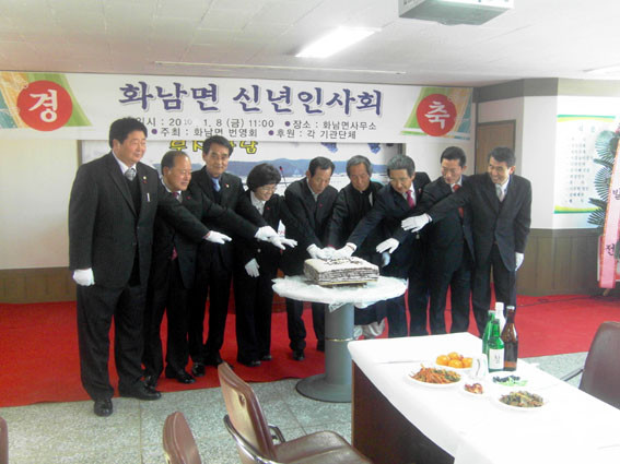 이날 면의 발전과 면민들의 건강과 행복을 기원한다는 번영회장의 인사를 시작으로 내빈들의 새해인사에 이어 사물놀이 공연, 시루떡 절단, 축배, 다과회를 가졌고, 직원들도 면민들과 새해인사를 나누며 화남면 발전을 기원했다.