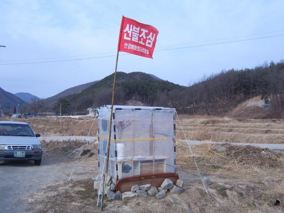 고경면 오룡리와 안강읍 하곡리 경계 부근에 비닐로 만든 산불감시 초소가 있어 눈길을 끌고 있다. 추운 날씨 탓에 평지에 비닐 초소 등장은 올해가 처음이다.