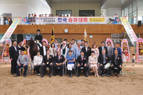 ↑↑ 2011년 6월 18일부터 3일간 영천운주산승마장에서 열린 제12회 문광부장관기 전국승마대회에 탤런트 홍요섭(뒤줄 말을 탄 모습), 개그우먼 배연정(앞줄 좌측에서 다섯 번째) 등 선수224명이 출전해 성황을 이뤘다. (사진제공 : 영천시)