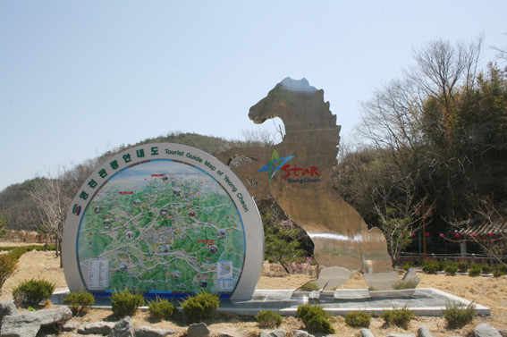 ↑↑ 영천으로 진입하는 길목인 북안면(돌할매앞) 도로변에 설치된 초대형 영천 관광안내도에는 말 형상과 함께 제작돼 말의 도시임을 홍보하고 있다.
