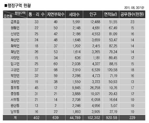 16개 읍면동 기본 현황을 보면 인구는 동부동이 2만6258명으로 가장 많고 자양면이 1181명으로 가장 적다. 통리의 경우 동부동이 45개로 가장 많고 완산동이 13개로 가장 적다. 면적은 고경면이 120.58㎢으로 가장 넓고 완산동이 5.07㎢으로 가장 좁은 것으로 나타났다. 동부동 인구(6월30일 기준)는 시 전체인구(10만2302명)의 4분의1이 넘는 2만6258명(26%)이지만 동사무소직원은 고작 17명에 불과하다. 주민 1544명당 공무원1명으로 행정서비스가 취약할 수밖에 없는 상황이다.