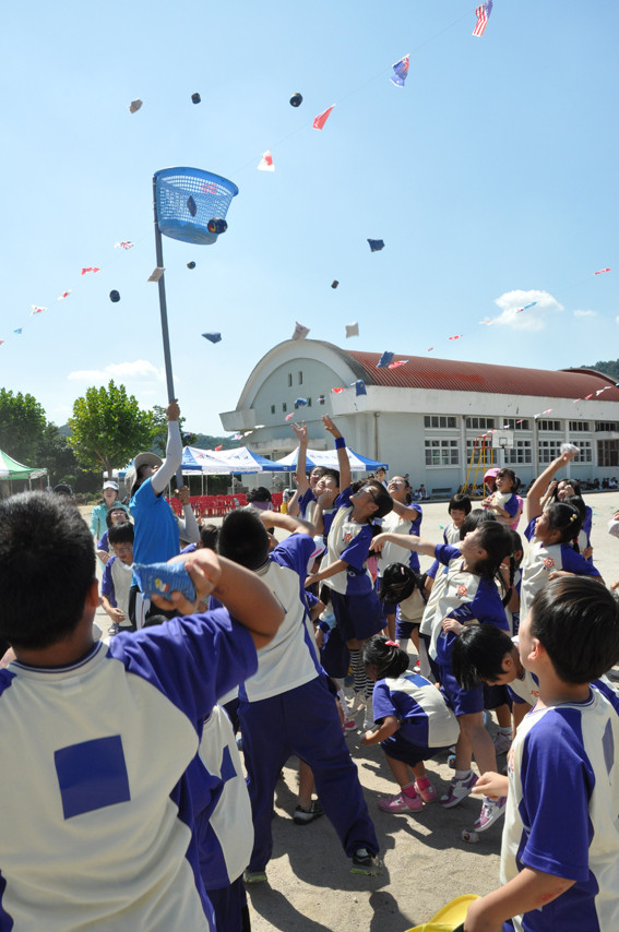 추분(秋分)인 지난 23일 푸른 가을 하늘 아래서 북안초등, 거여초등, 남부초등 학생들이 북안초등학교 운동장에 모여 합동으로 가을 운동회를 열었다.사진은 점심시간 알리는 오자미던지기 경기를 하고 있는 학생들의 모습.
