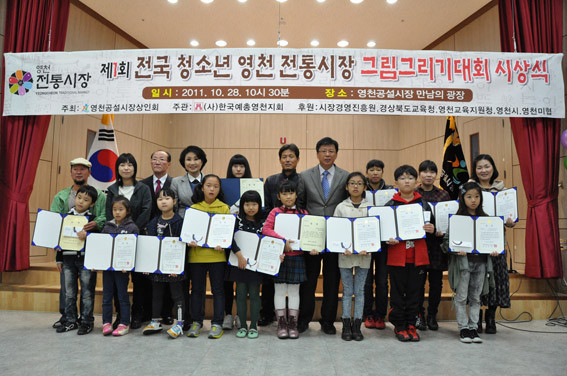 제1회 전국 청소년 전통시장 그림그리기대회 공모전 시상식이 지난 28일 공설시장 만남의 광장 대회의실에서 한혜련 도의원, 김영우 상인회장, 우은복 교육장, 정상용 동부동장을 비롯해 수상자 및 학부모가 참가한 가운데 열렸다.