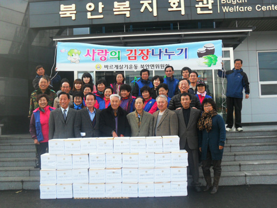 바르게살기운동 북안면위원회는 지난 23일 회원30명과 함께 배추 150포기로 김장을 담아 독거노인 및 소년소녀가장 35가구에 작은 사랑의 손길을 주었다. 북안면위원회는 김장담그기로 사랑을 나눈 것이 올해로 12년째 이어오고 있으며 앞으로 더욱 확대해 나갈 방침이다. 이날 행사에는 김일홍 시협의회장과 백승표 북안면장, 김순화 사무국장을 비롯해 북안면 각급기관단체장이 함께 했다.