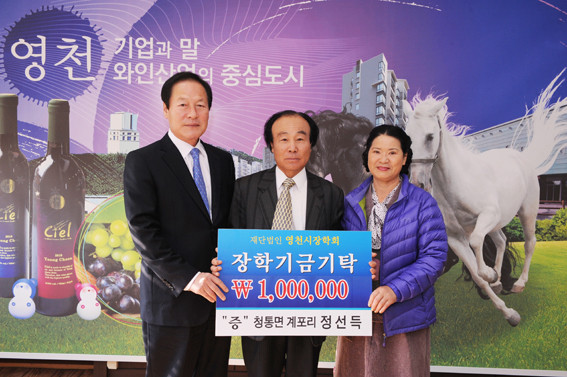 청통면 계포리의 정선득 이장은 얼마 전 아들의 혼사를 치렀는데 아들 결혼 축의금을 장학기금으로 내고 싶다고 장학회에 연락해 와 기탁이 이루어지게 되었다. 정선득 이장은 “기쁜 일은 함께 나누어야 더 크다고 생각한다. 작년에 장학사업 시민보고회를 통해서 우리 지역이 교육발전을 위해서 장학기금 조성에 힘쓰고 있다는 것을 알게 되어 기탁하게 되었다.”고 말했다.