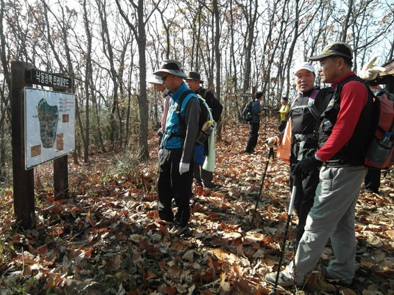 정상 밑에는 경상북도에서 설치한 낙동정맥 트레일로드 표지판이 있었다. 표지판을 살핀 대원들은 잘못 표기된 부분(이해가 안가는 곳)을 지적하기도 했다.
