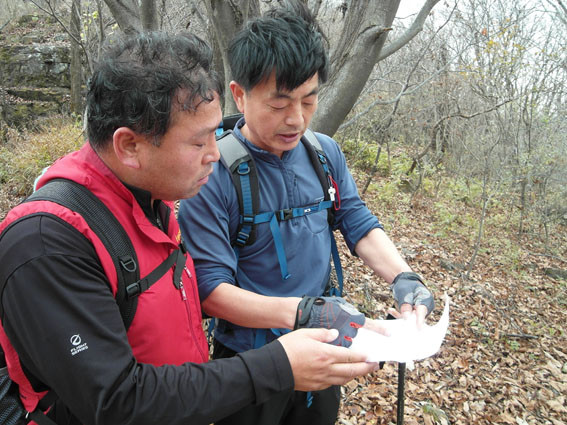 ↑↑ 김영모 탐사대장과 최병식 대원이 지형도를 살피고 있다.